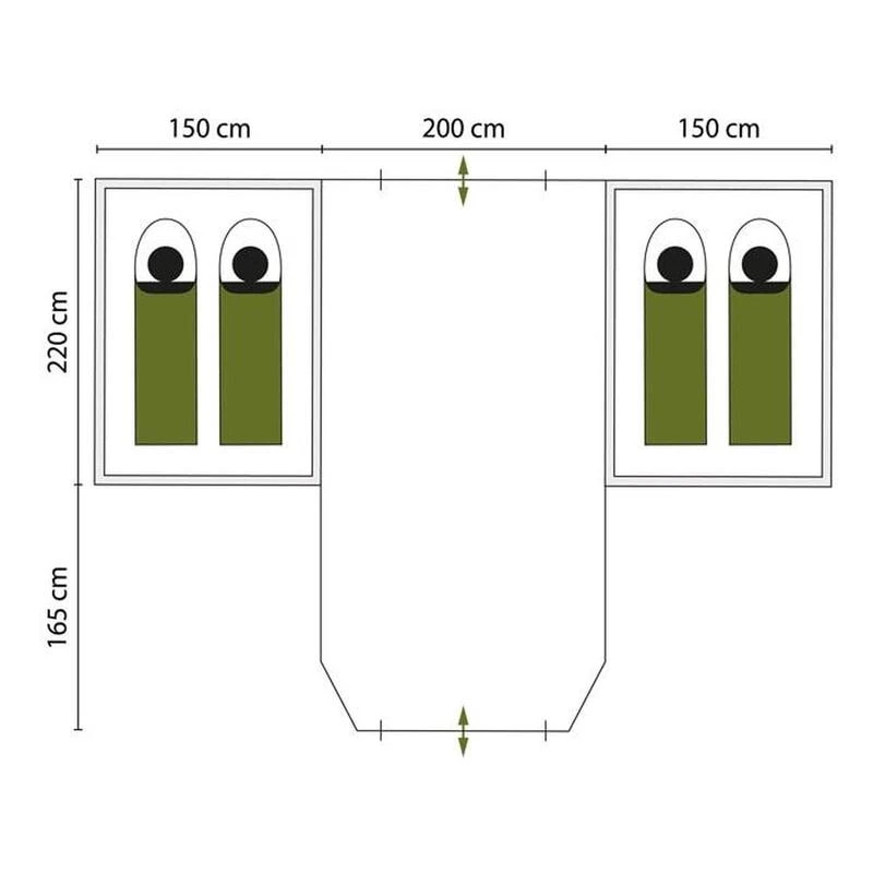500 x (220+165) x 200cm – très grand séjour – 2 cabines de couchage avec tapis de sol cousu – 2 entrées avec marquise – moustiquaires – colonne d’eau de 3.000 mm – ouvertures d’aération